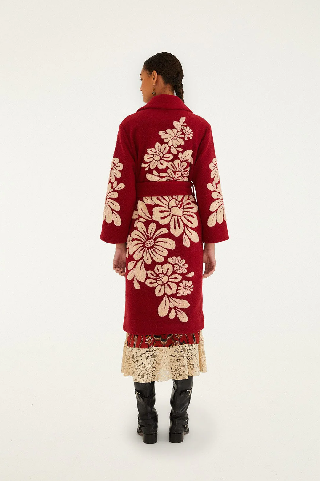 Wrap yourself in the cozy charm of the Burgundy Bold Flowers Fleece. This standout outerwear piece features a rich burgundy base adorned with large, playful cream floral motifs that dance across the fabric. Its relaxed silhouette and soft collar neckline invite warmth and ease, while the matching tie belt cinches the waist, adding a flattering shape. Perfect for bringing a touch of vibrant comfort to any day.